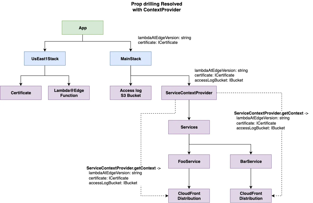 Instead of passing props, we introduce a new concept called ContextProvider. This is inspired by React’s Context API, and since CDK already has the concept of context, it fits surprisingly well. ContextProvider allows passing properties to descendants in the construct tree without using props.