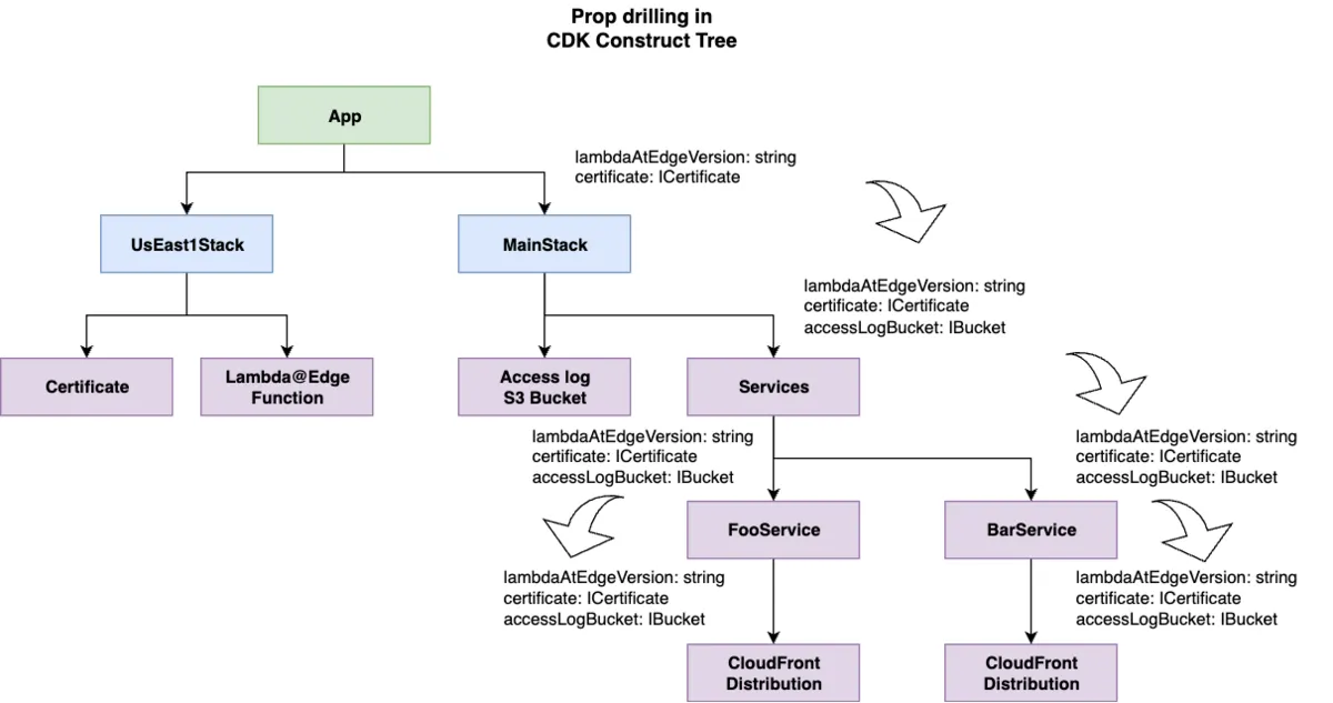 When taking this approach, passing properties from parent layers to deeply nested child constructs can become cumbersome. This is commonly known as props bucket relay or prop drilling.